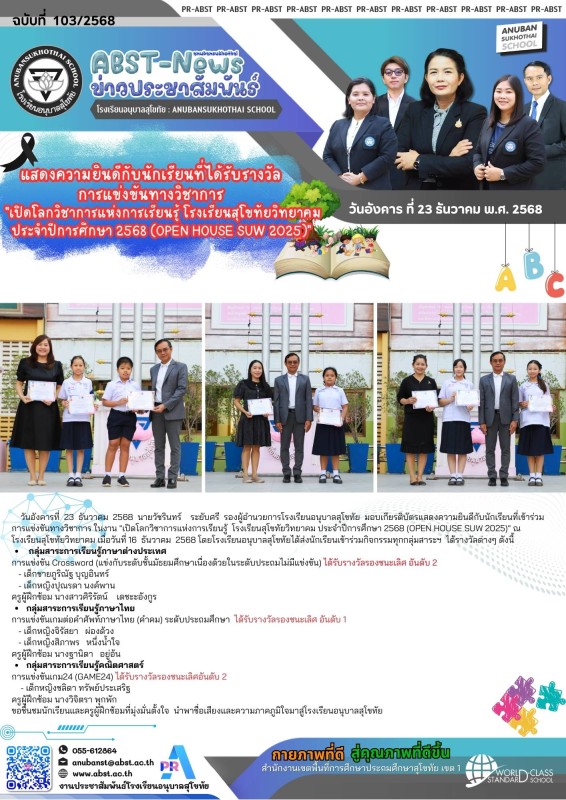 แสดงความยินดีกับนักเรียนที่ได้รับรางวัล การแข่งขันทางวิชาการ "เปิดโลกวิชาการแห่งการเรียนรู้ โรงเรียนสุโขทัยวิทยาคม ประจำปีการศึกษา 2568 (OPEN HOUSE SUW 2025)"