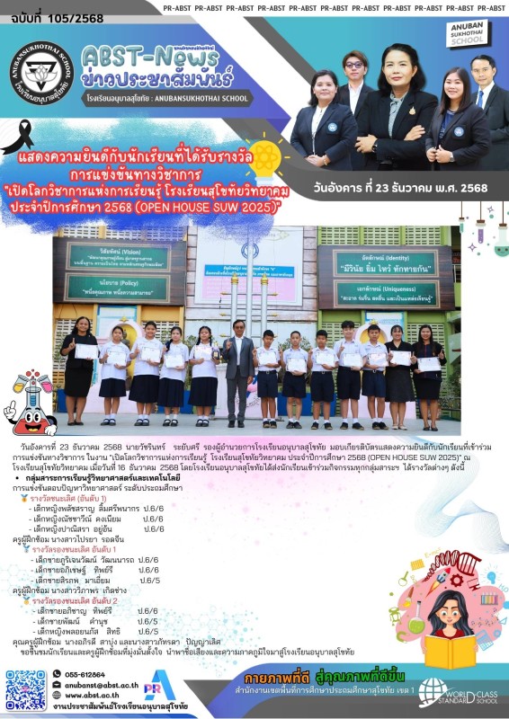 แสดงความยินดีกับนักเรียนที่ได้รับรางวัล การแข่งขันทางวิชาการ "เปิดโลกวิชาการแห่งการเรียนรู้ โรงเรียนสุโขทัยวิทยาคม ประจำปีการศึกษา 2568 (OPEN HOUSE SUW 2025)"