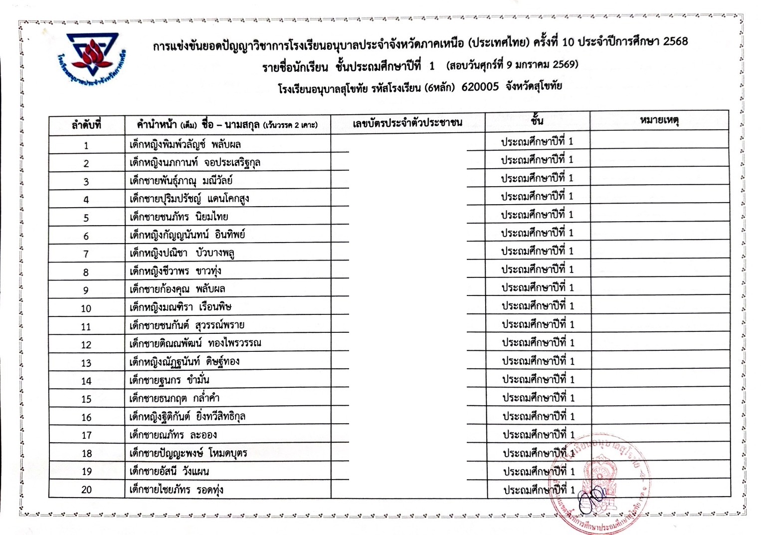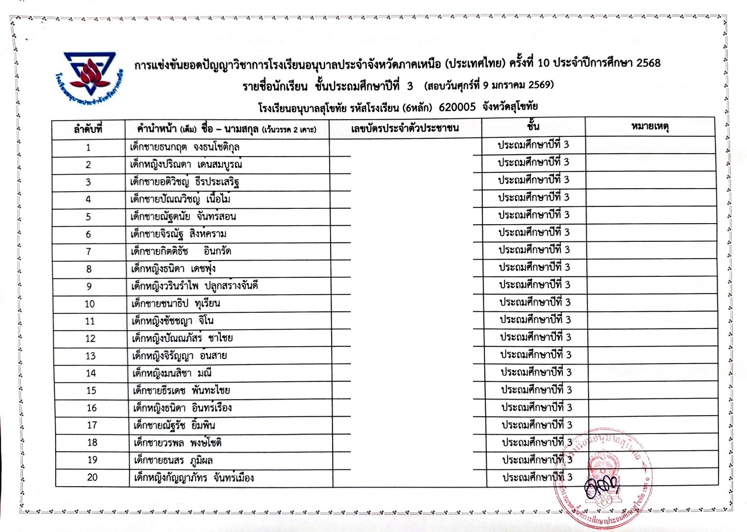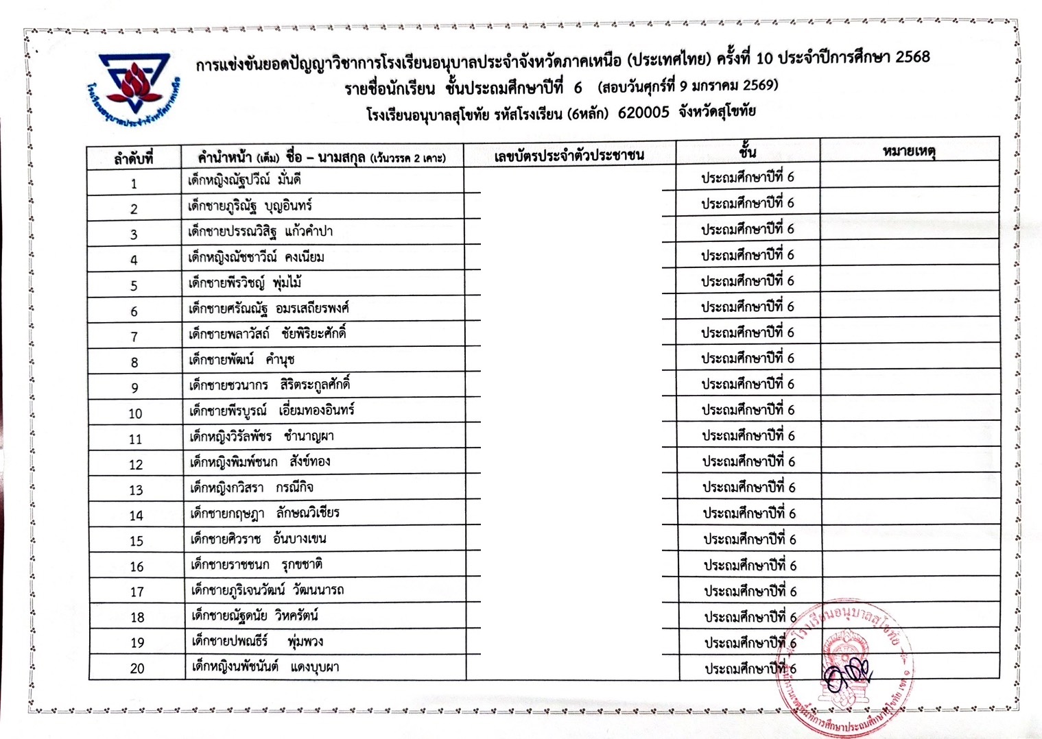 รายชื่อนักเรียนรายการแข่งขันยอดปัญญาวิชาการโรงเรียนอนุบาลประจำจังหวัดประเทศไทย (ภาคเหนือ) ครั้งที่ 9 ประจำปีการศึกษา 2567 17 ม.ค. 68