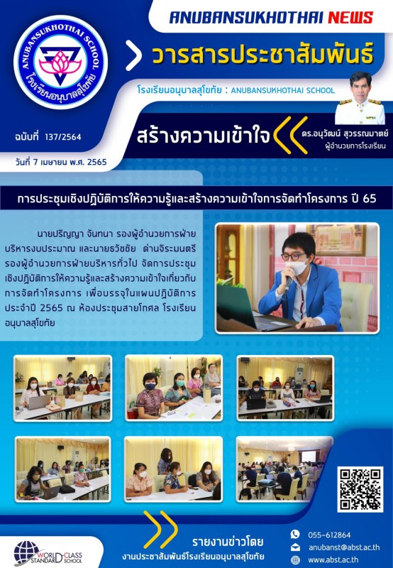 นายปริญญา จันทนา รองผู้อำนวยการฝ่ายบริหารงบประมาณ และนายธวัชชัย ด่านจิระมนตรี รองผู้อำนวยการฝ่ายบริหารทั่วไป จัดการประชุมเชิงปฏิบัติการ ให้ความรู้และสร้างความเข้าใจเกี่ยวกับการจัดทำโครงการ เพื่อบรรจุในแผนปฏิบัติการประจำปี 2565 ณ ห้องประชุมสายโกศล โรงเรียนอนุบาลสุโขทัย