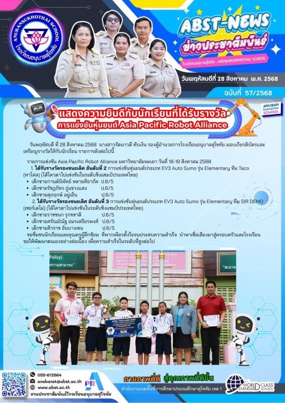แสดงความยินดีกับนักเรียนที่ได้รับรางวัล การแข่งขันหุ่นยนต์ Asia Pacific Robot Alliance