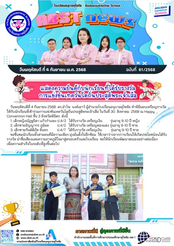 แสดงความยินดีกับนักเรียนที่ได้รับรางวัล การแข่งขันเทควันโดถิ่นประสูติพระเจ้าเสือ