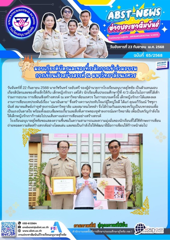 มอบเกียรติบัตรและของที่ระลึกการเข้าร่วมอบรมการเขียนเชิงสร้างสรรค์ ณ มหาวิทยาลัยนเรศวร