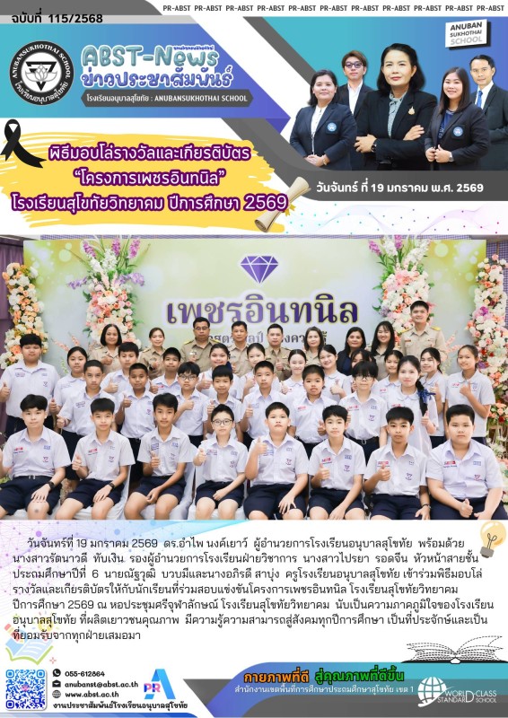 พิธีมอบโล่รางวัลและเกียรติบัตร “โครงการเพชรอินทนิล” โรงเรียนสุโขทัยวิทยาคม ปีการศึกษา 2569