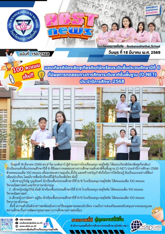 มอบเกียรติบัตรเชิดชูเกียรติแก่นักเรียนระดับชั้นประถมศึกษาปีที่ 6 ที่มีผลการทดสอบทางการศึกษาระดับชาติขั้นพื้นฐาน (O-NET) ประจำปีการศึกษา 2568