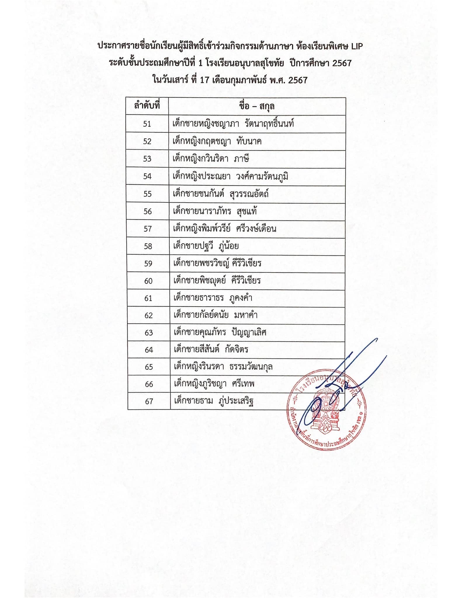 ประกาศรายชื่อนักเรียนที่มีสิทธิ์เข้าร่วมกิจกรรมด้านภาษา ห้องเรียนพิเศษ ระดับชั้นอนุบาลปีที่ 2 และชั้นประถมศึกษาปีที่ 1