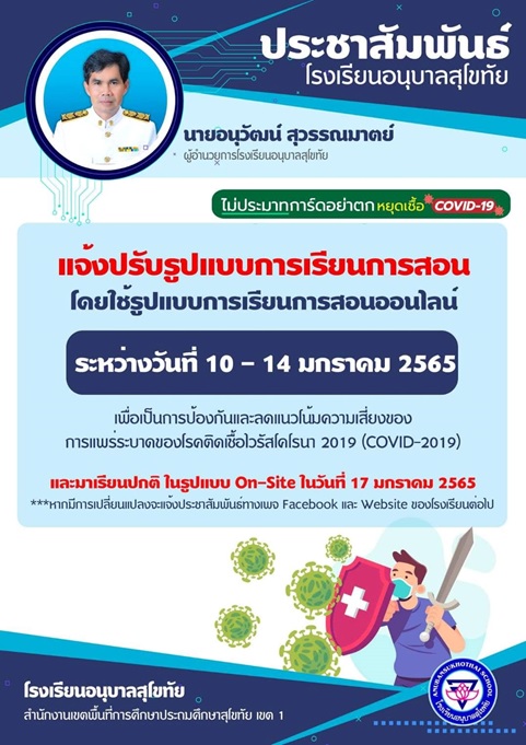 เนื่องด้วยในช่วงวันหยุดยาวเทศกาลปีใหม่ มีผู้ปกครองหรือญาติของนักเรียนเดินทางมาจากต่างจังหวัดจำนวนมาก อีกทั้งมีคลัสเตอร์ผู้ติดเชื้อไวรัสโคโรนา 2019 (สายพันธุ์โอมิครอน) ในจังหวัดเพิ่มขึ้น ทางโรงเรียนอนุบาลสุโขทัย ตระหนักถึงความปลอดภัยของนักเรียน เพื่อป้องกันและลดแนวโน้มความเสี่ยงของโรคติดเชื้อไวรัสโคโรนา 2019 (Covid-19) จึงปรับรูปแบบการเรียนการสอนโดยใช้รูปแบบการเรียนการสอน Online และ On-Demand ต่ออีก 1 สัปดาห์ คือตั้งแต่วันที่ 10 - 14 มกราคม 2565 หากมีการเปลี่ยนแปลงจะแจ้งประชาสัมพันธ์ทาง Facebook และ Website ของโรงเรียนต่อไป